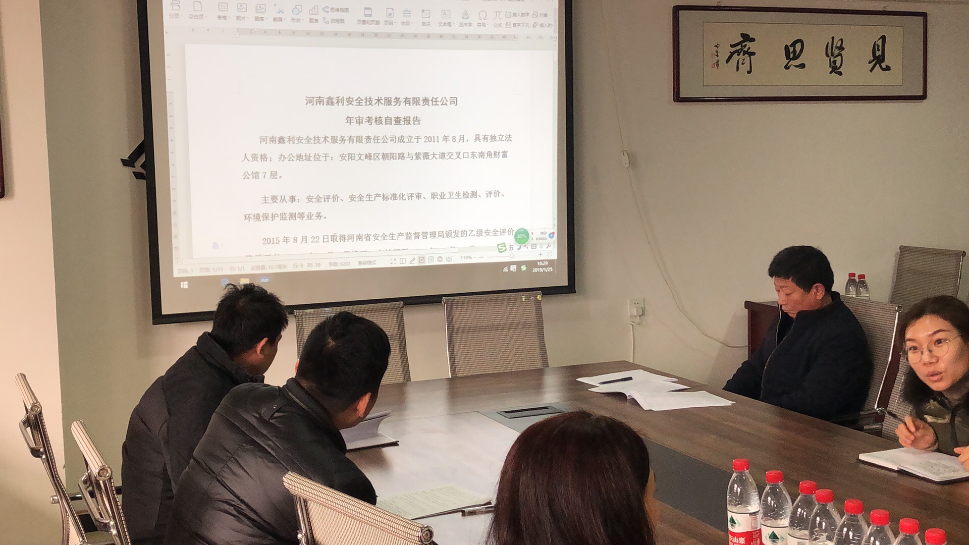 2019年1月25日,河南鑫利安全技術服務有限責任公司 副總經理郭一楠主持召開了2018年安全評價機構自查報告年審考核工作會議。